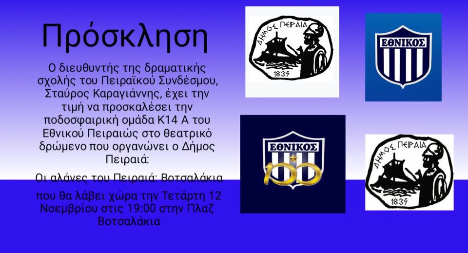 Στα πλαίσια του δρώμενου του Δήμου Πειραιά «Οι Αλάνες του Πειραιά», η ομάδα Κ14 Α' της Ακαδημίας μας προσκλήθηκε από τον Διευθυντή της Δραματικής Σχολής του Πειραϊκού Συνδέσμου, κ. Σταύρο Καράγιαννη, να συμμετάσχει στη θεατρική δράση που θα πραγματοποιηθεί την Τετάρτη 12 Νοεμβρίου, και ώρα 19:00, στα Βοτσαλάκια.